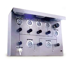 This is our stock four cascade cylinder stainless steel panel. Just as with all our panels, it comes with flow-directional pin stripping, four upper cylinder gauges and on/off panel valves control air flow from each air storage cylinder, a 4" Dia. accurate SCBA fill gauge, precise pressure reducing regulator and two fill hose outlets are provided on the bottom. Fill hoses are priced separately. This unit is available in a vertical configuration with the same components.